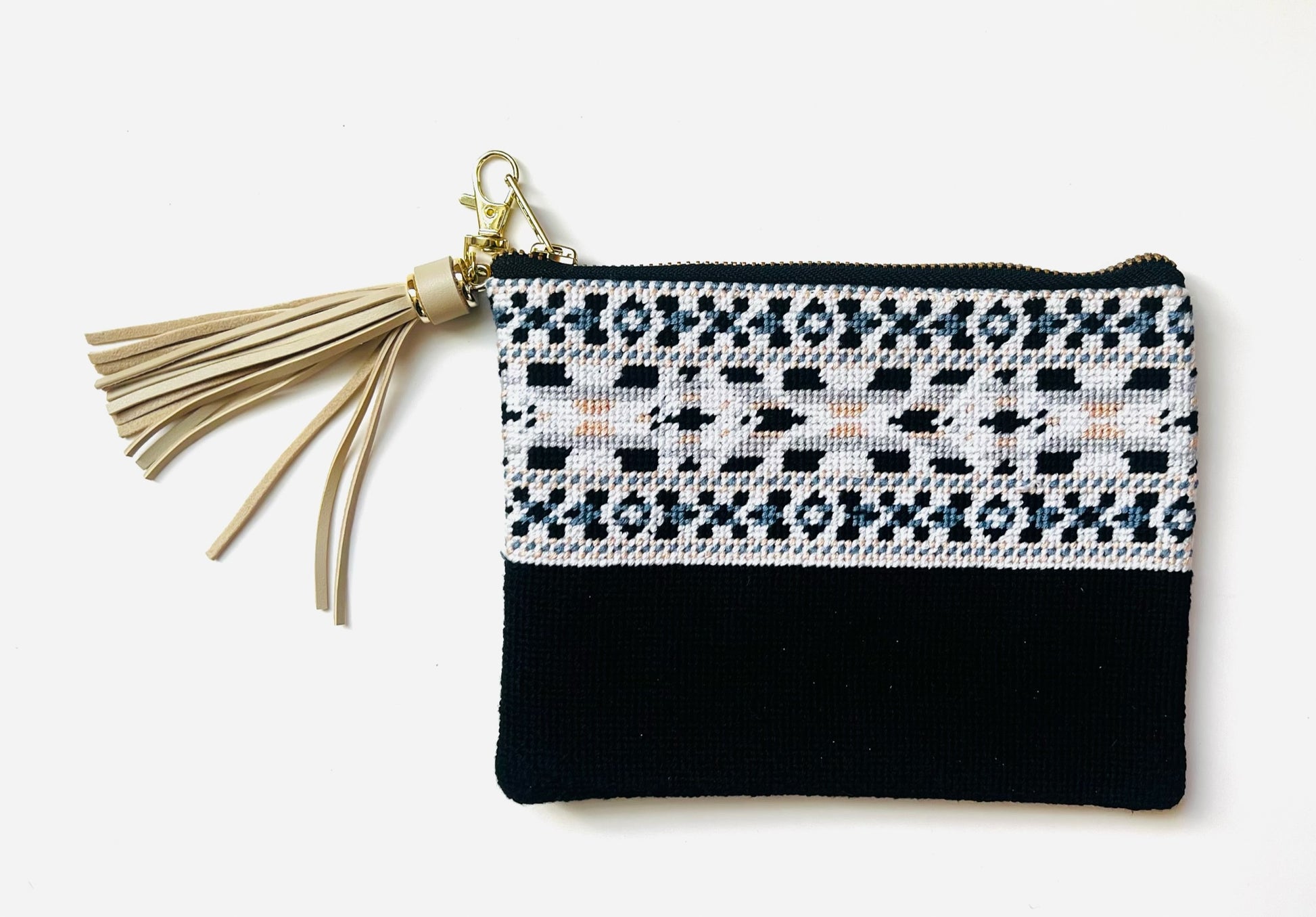 Inspired by vintage Jacquard ribbon patterns, the Ribbon clutch in neutrals on black makes a big impact as the perfect little everyday bag.