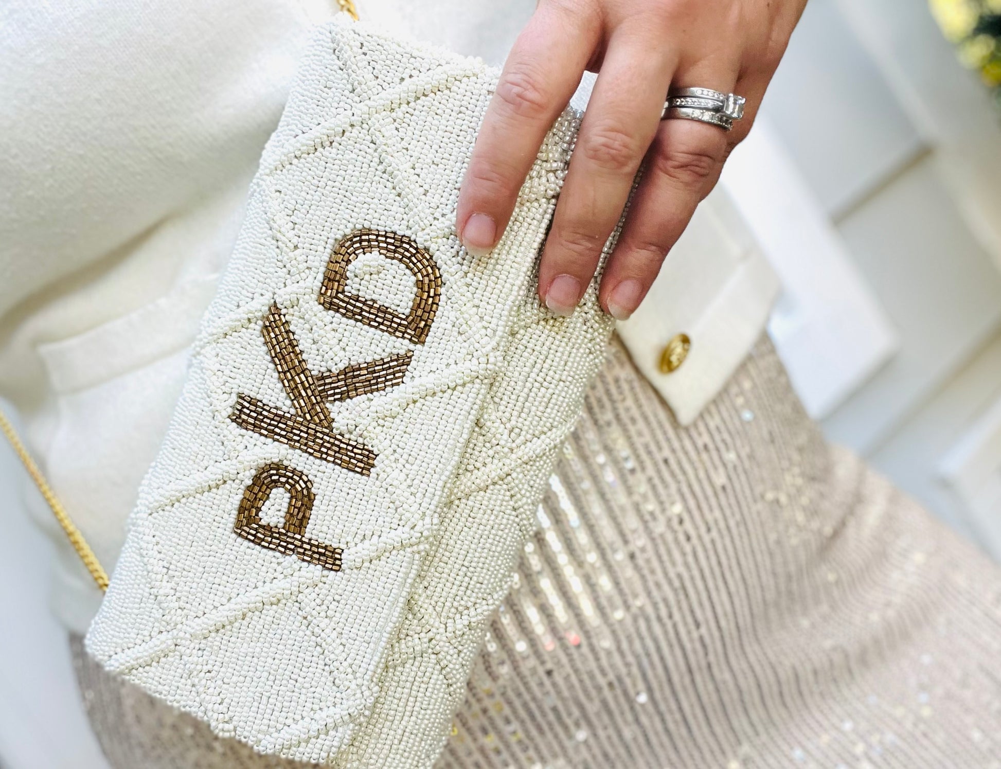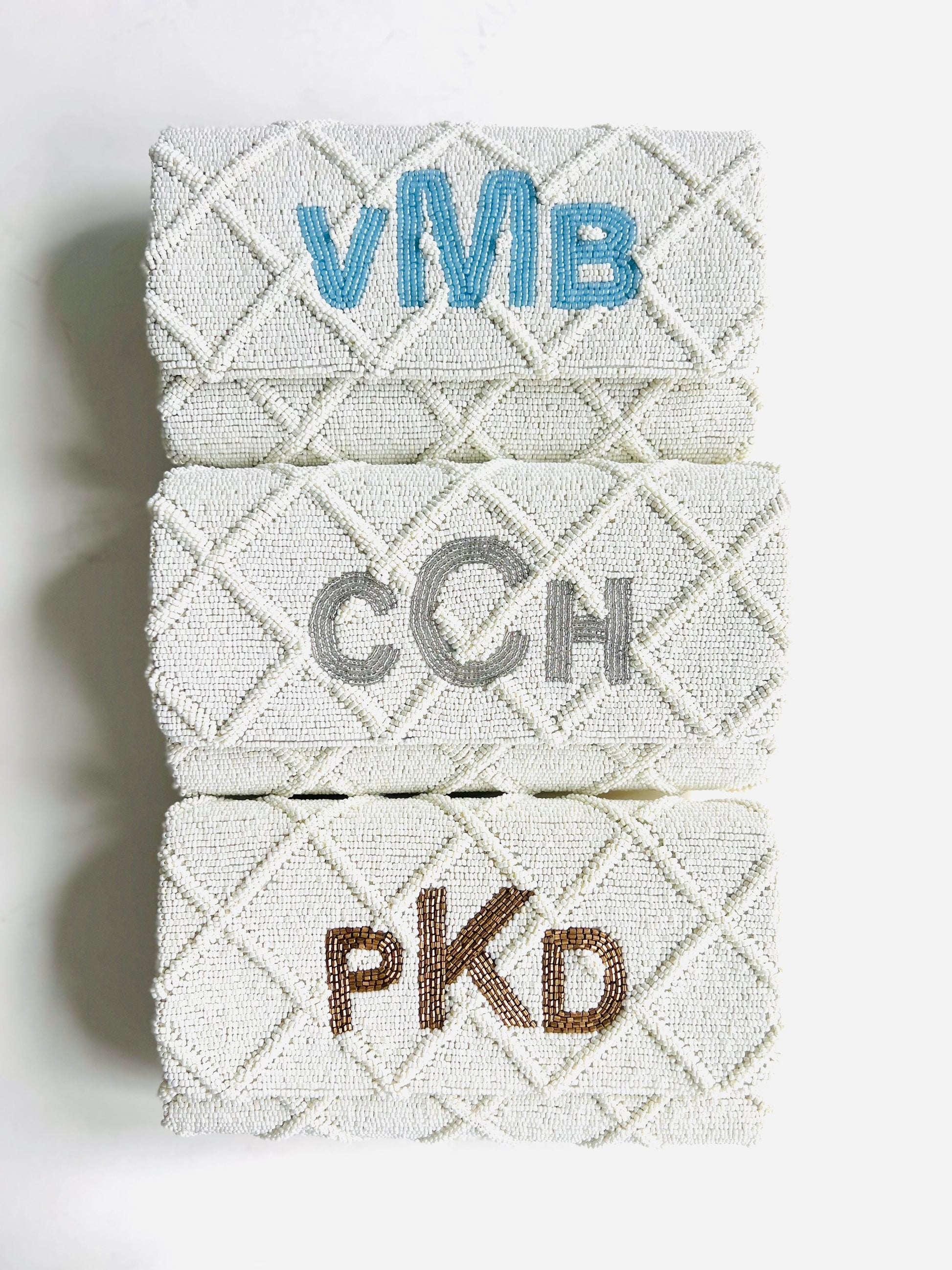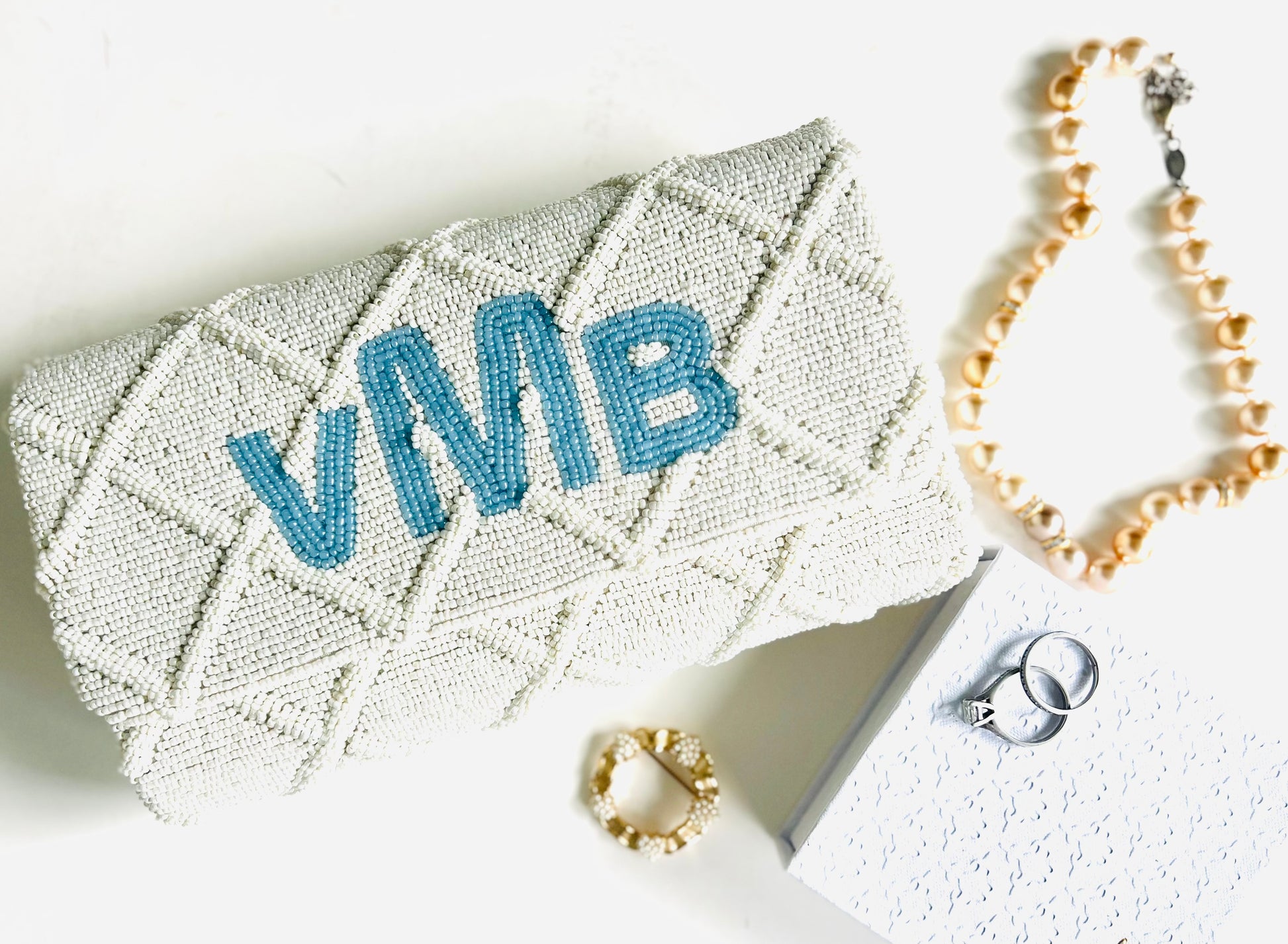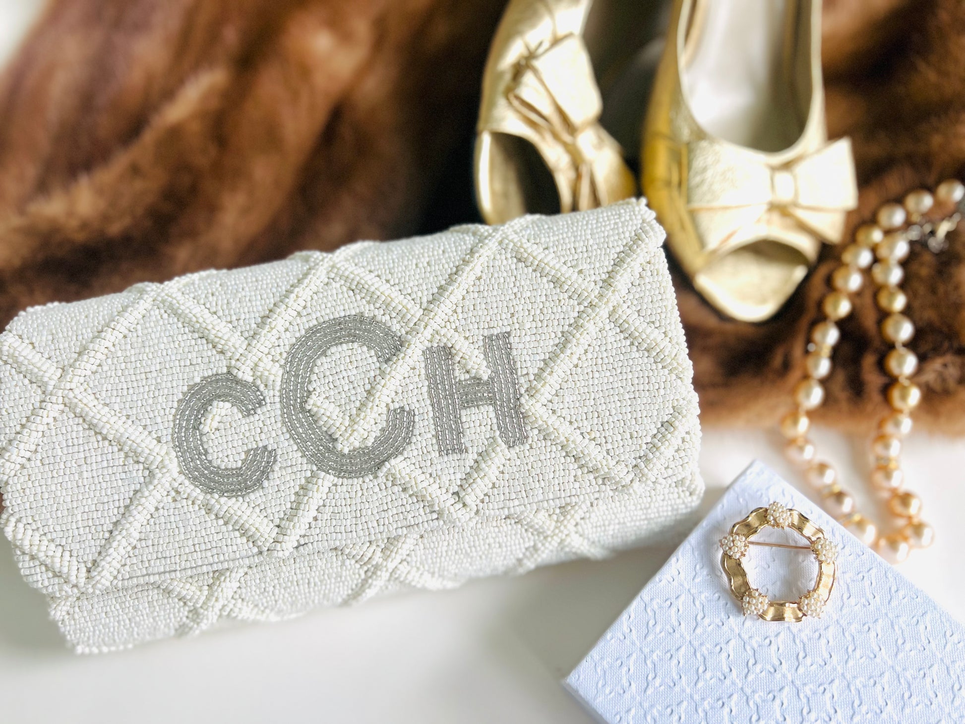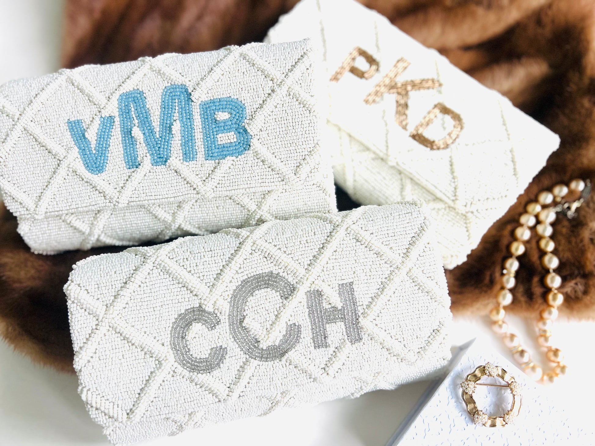 Commemorate your big day in the most classic way with your new monogram on the outside and your special date on the inside of this timeless foldover cream lattice beaded clutch. Also perfect for mother of the bride, mother of the groom and bridesmaid gifts!