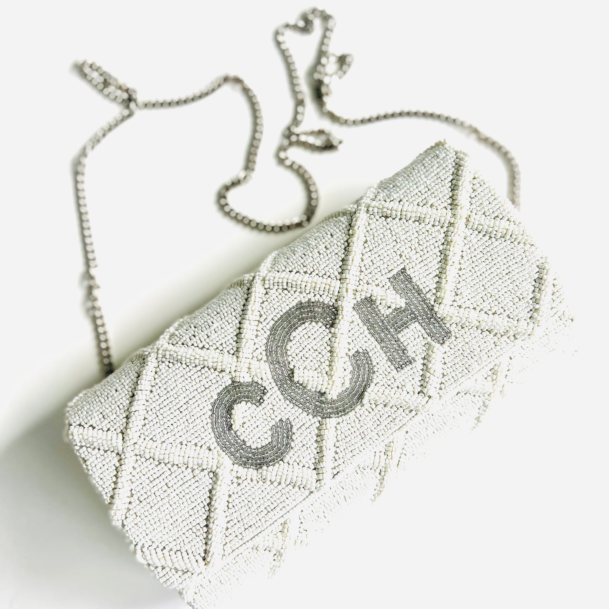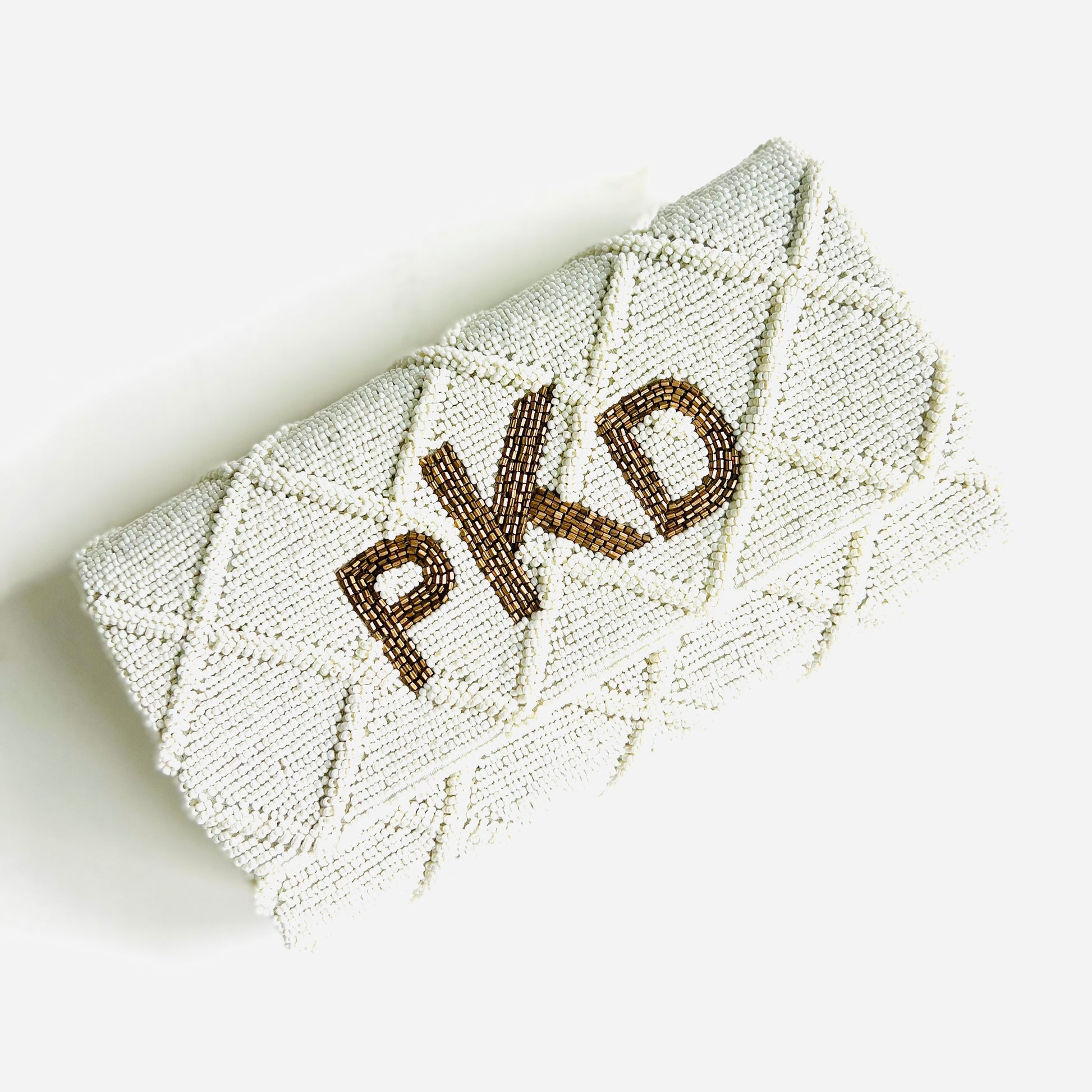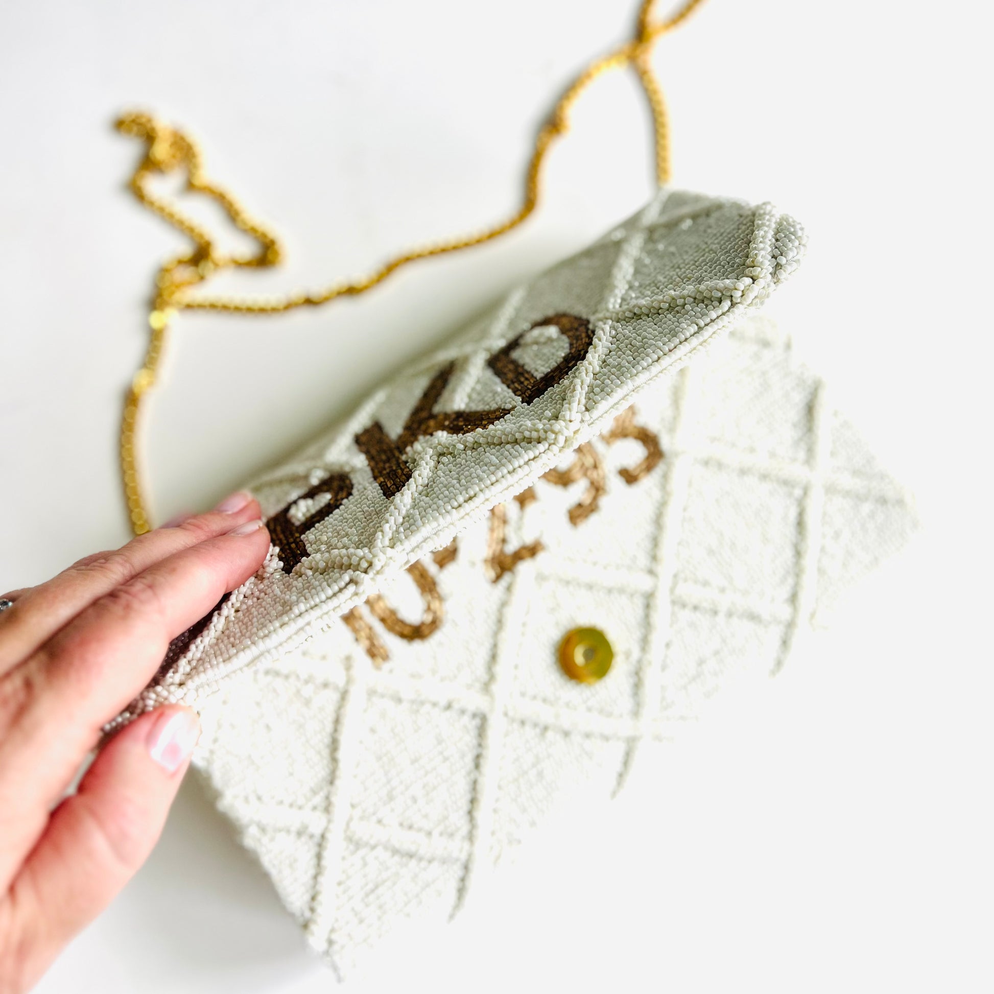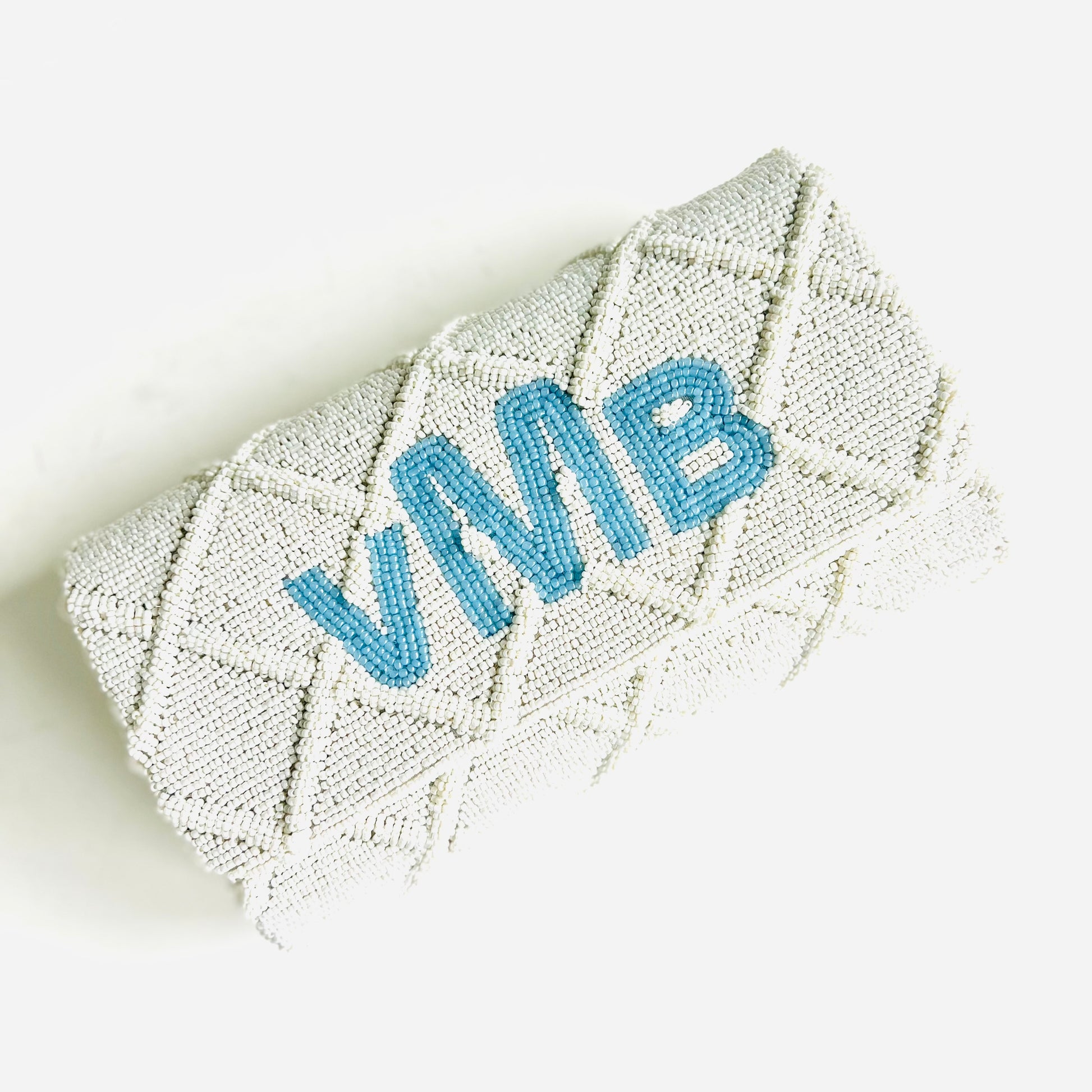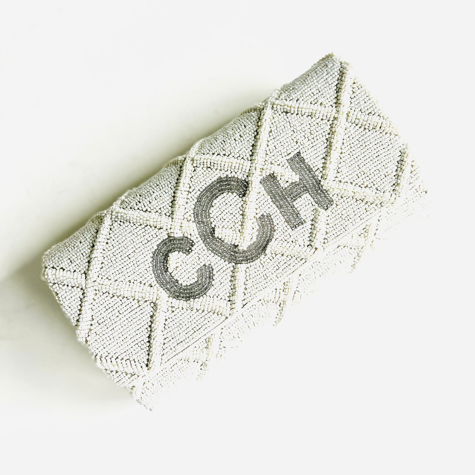 Commemorate your big day in the most classic way with your new monogram on the outside and your special date on the inside of this timeless foldover cream lattice beaded clutch. Also perfect for mother of the bride, mother of the groom and bridesmaid gifts!